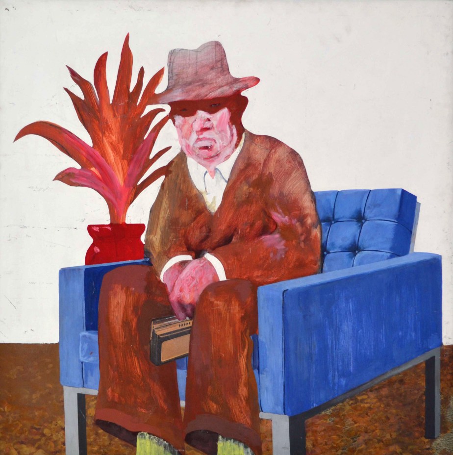 Oil, household paint and collage on Masonite hardboard, 92 x 92 cm.