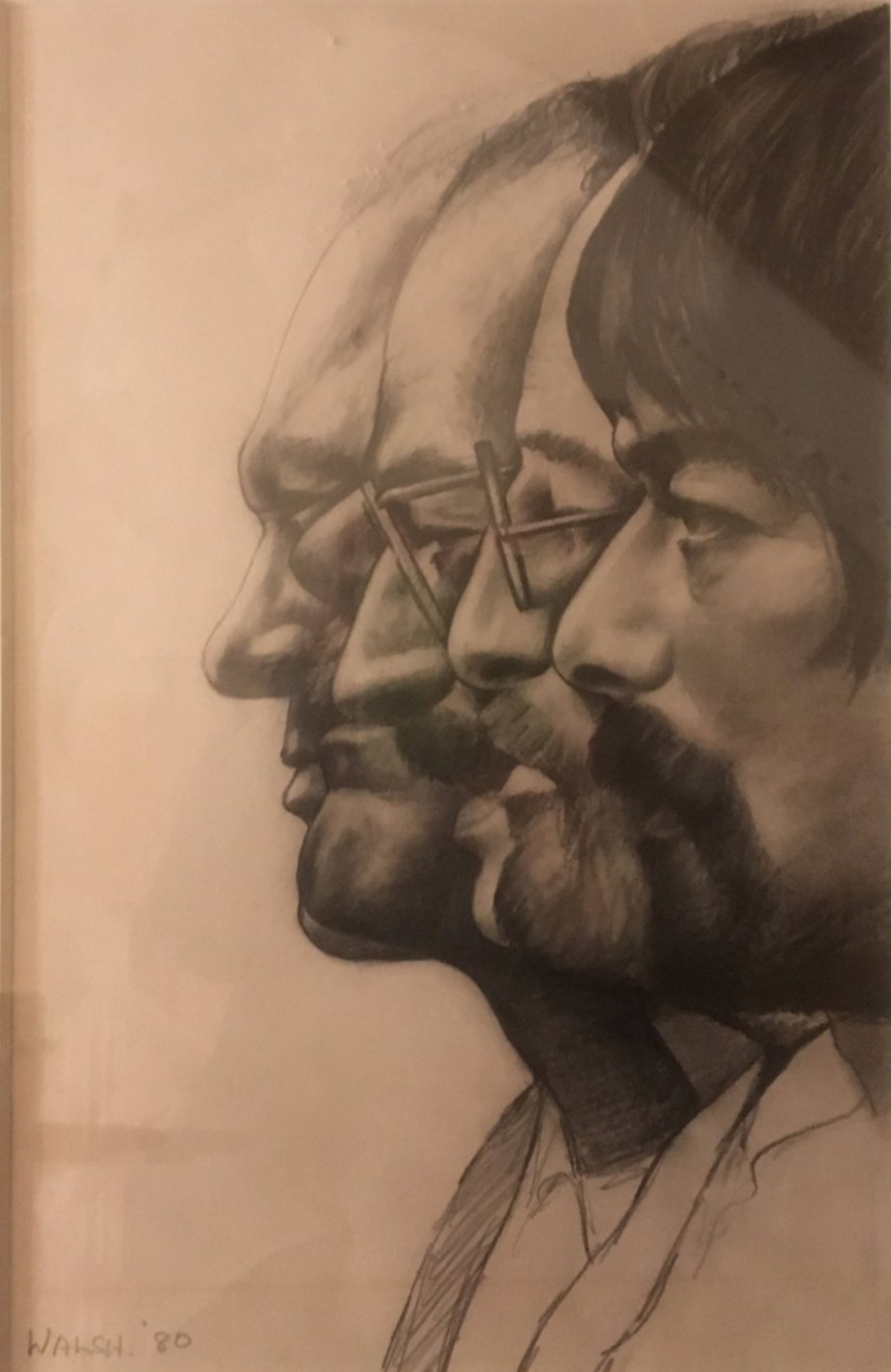 Notes: Study for the painting The Dinner Party, depicting, left to right: Maurice Cockrill, Sam Walsh, Roger McGough, Adrian Henri and Billy Wellings.